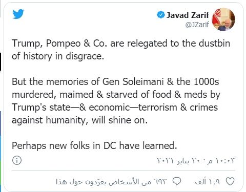 وكتب ظريف على "تويتر": "ذكرى قاسم سليماني والآلاف الذين قتلتهم إدارة ترامب وشوهتهم وجوعتهم وحرمتهم الدواء ستظل خالدة وربما يتعلم الدرس، الأشخاص الجدد في واشنطن".