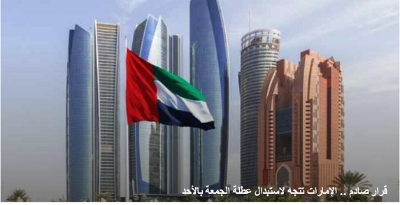 أشارت تقارير مختلفة إلى أن الإمارات قد تنتقل إلى عطلة نهاية الأسبوع يومي السبت والأحد بدلا عن الجمعة والسبت، بما يتماشى مع النظام المعمول به لدى الكثير من دول العالم.