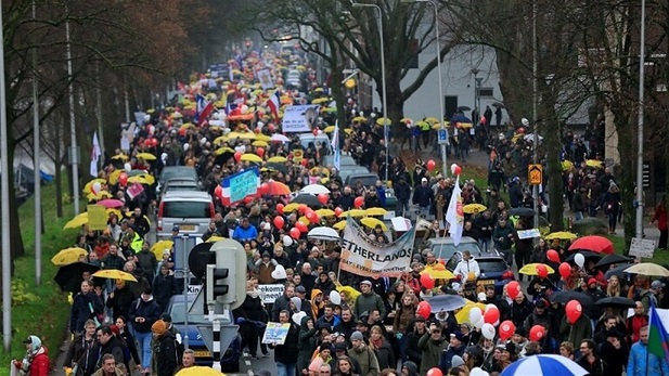 وسار المحتجون في شوارع البلدة رافعين لافتات تقول "الحرية الطبية الآن!" ولوحوا بالعلم الهولندي.