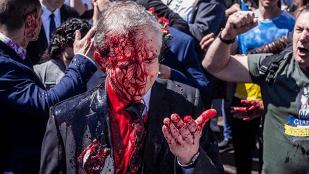 تعرض سفير روسيا في وارسو، اليوم الإثنين، للرش بمادة حمراء من قبل نشطاء مؤيدين لأوكرانيا، عندما حاول وضع إكليل من الزهور لإحياء ذكرى هزيمة ألمانيا النازية في الحرب العالمية الثانية.