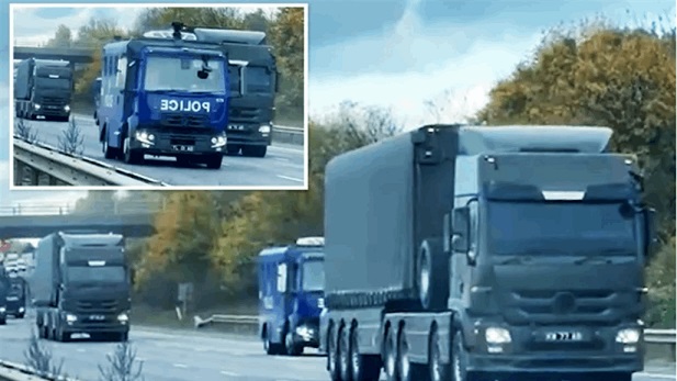 وقالت "الصن" إن 6 مركبات كبيرة من الشرطة البريطانية رافقت 4 شاحنات عسكرية عملاقة أثناء مرورها في طريق سريع.