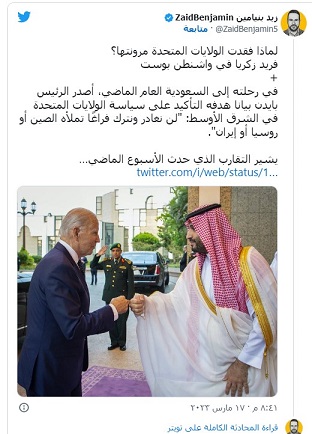 وتداول نشطاء مقال فريد زكريا، حول السياسة الخارجية الأمريكية وحدث ما قال بايدن إنه لن يحدث خلال زيارته الأخيرة إلى العاصمة السعودية، حيث نشر المحلل السياسي المقال بصحيفة واشنطن بوست، وقال فيه: "في رحلته إلى المملكة العربية السعودية العام الماضي، أصدر الرئيس بايدن إعلانا مؤكدا سياسة الولايات المتحدة في الشرق الأوسط: "لن نغادر ونترك فراغا تملأه الصين أو روسيا أو إيران"..يشير للتقارب الذي حدث الأسبوع الماضي بين السعودية وإيران، بوساطة الصين، إلا أن هذا هو بالضبط ما حدث".