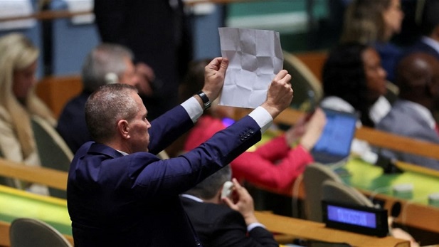 طُرد المندوب "الإسرائيلي" لدى الأمم المتحدة، جلعاد إردان، من قاعة الجمعية العامة التابعة للمنظمة الدولية، وذلك بعدما رفع لافتةً خلال إلقاء الرئيس الإيراني، إبراهيم رئيسي، كلمته أمام زعماء العالم، في أعمال الدورة الـ78 للجمعية العامة، وأثار تصرفه ردود أفعال على شبكات التواصل الاجتماعي.