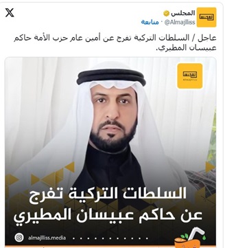 وقال حساب "المجلس" التابع لوزارة الإعلام الكويتية على منصة (x) إن "السلطات التركية تفرج عن أمين عام حزب الأمة حاكم عبيسان المطيري".