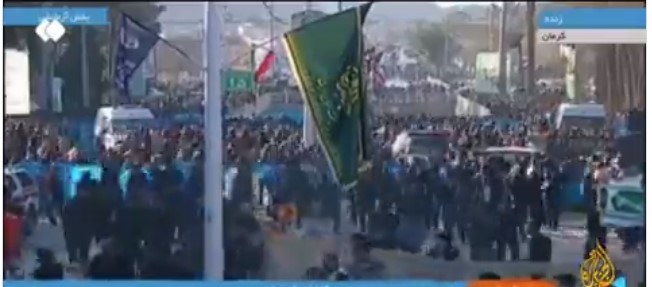 وأعلن التلفزيون الرسمي بداية عن "سماع دوي انفجار قرب مسجد صاحب الزمان في محافظة كرمان بجنوب الجمهورية الإسلامية، حيث يرقد القائد السابق لفيلق القدس في الحرس الثوري. وفي وقت لاحق، أفاد التلفزيون عن "سماع دوي انفجار ثانٍ" في المكان ذاته".