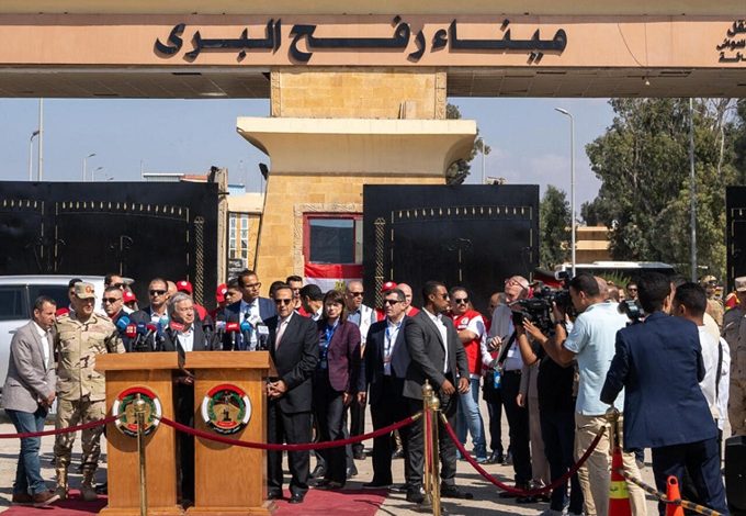 صرّح الأمين العام للأمم المتحدة، أنطونيو غوتيريش قائلاً، نحن في معبر رفح اليوم لتسليط الضوء على الصعوبات التي يواجهها الفلسطينيون في قطاع غزة، والفلسطينيون يستحقون اتفاقا لوقف النار.