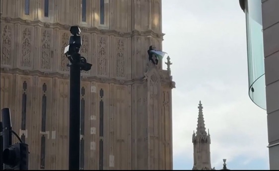 قامت الشرطة البريطانية بإنزال رجل تسلق برج إليزابيث في البرلمان البريطاني (المعروف باسم ساعة بيغ بن الشهيرة)، مساء اليوم السبت (8 آذار 2025)، حيث وصل إلى منتصف البرج تقريبًا. وكان الرجل يحمل علم فلسطين ويهتف بالحرية للفلسطينيين أثناء تسلقه.