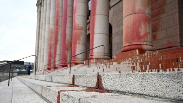 وضع ناشطون طلاء بلون الدم على واجهة مبنى وزارة الدفاع الفنلندية في هلسنكي، احتجاجاً على تعاونها مع إسرائيل.
