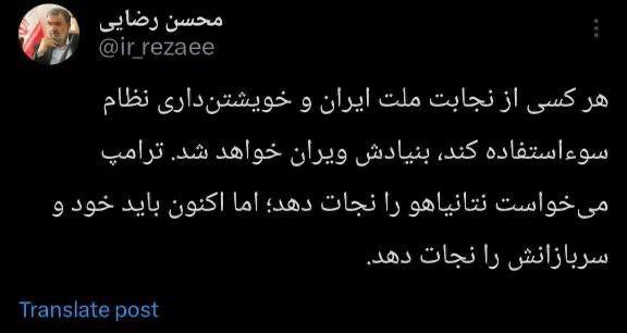 القائد العام الاسبق لحرس الثورة الاسلامية اللواء محسن رضائي: ترامب أراد إنقاذ نتنياهو، لكن عليه الآن إنقاذ نفسه وجنوده