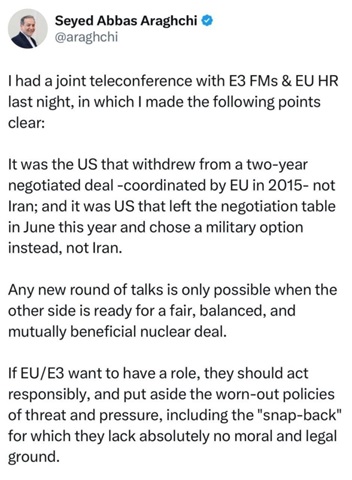 التهديدات الأوروبية جاءت ردا على قرار إيران تعليق تعاونها مع الوكالة الدولية للطاقة الذرية، عقب العدوان الإسرائيلي على منشآتها الحيوية الشهر الماضي.