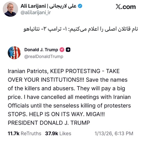 وقال لاريجاني في تعليق رداً على قول ترامب (احفظوا أسماء القتلة والمعتدين) :"أقوم الآن بنشر أسماء أبرز هؤلاء القتلة". وأضاف لاريجاني أن القائمة تضم "أولاً ترامب، وثانياً نتنياهو"، وذلك في إطار التصعيد الكلامي المتبادل بين واشنطن وطهران حول الاحتجاجات في إيرانز