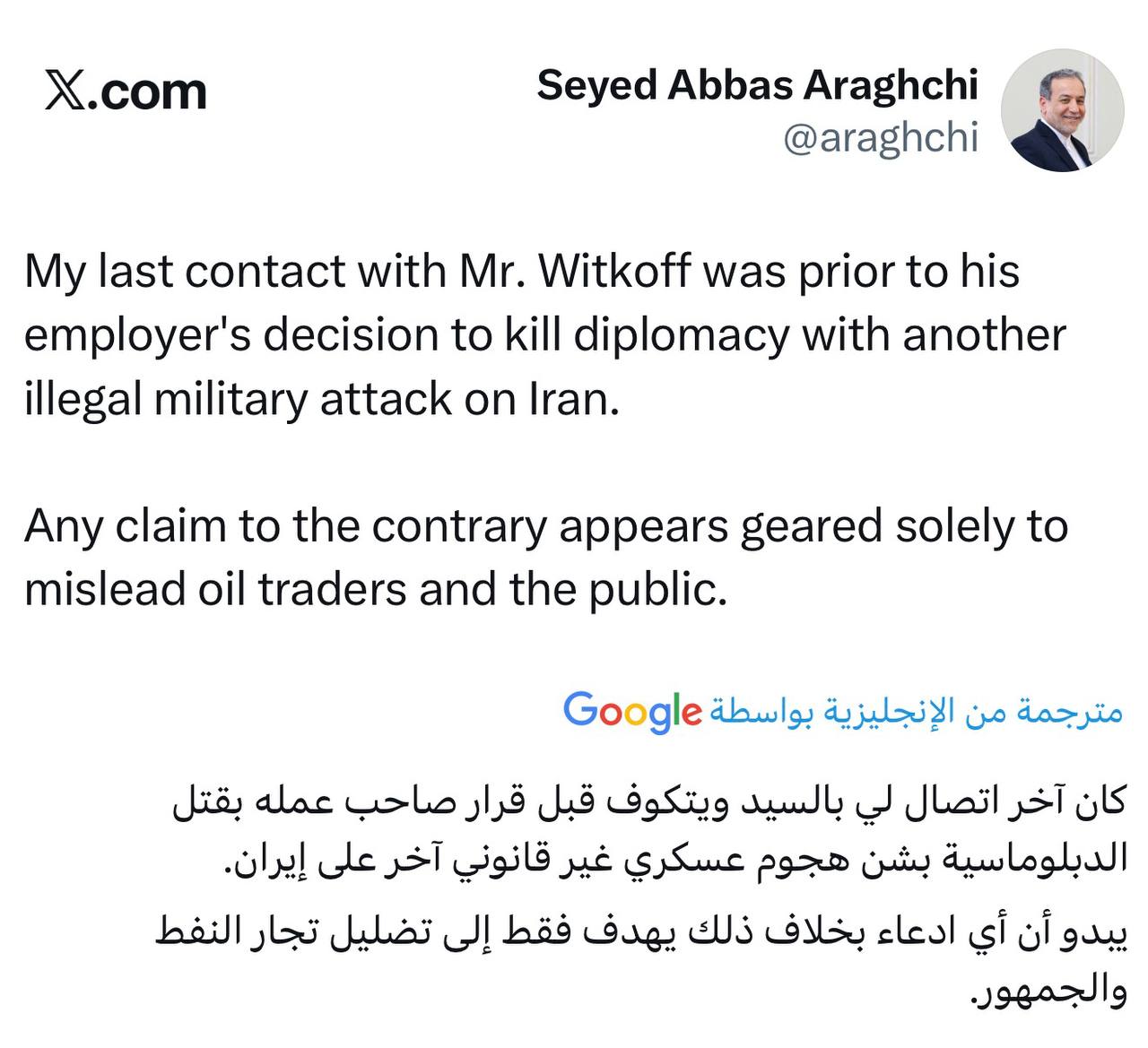 ملاحظة: التغريدة رداً على تقرير اكسسيوس التي ادعت ان عراقچي تواصل مع ويتكوف من اجل التفاوض