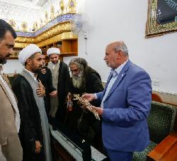 من جانبه قدم نائب الامين العام للعتبة العلوية خالد هادي شنون الشكر للوفد الضيف مقدما لهم عددا من الهدايا المباركة من العتبة وراية للقبة العلوية.