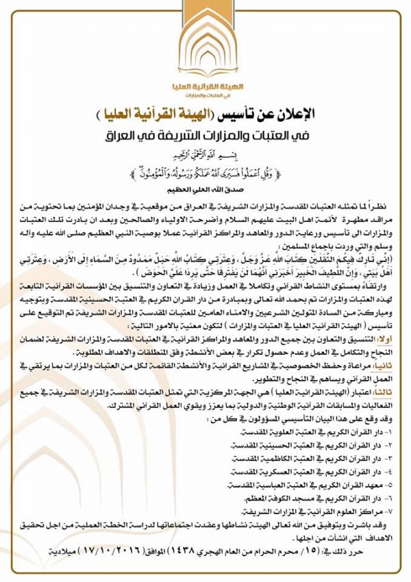 يذكر أن بيان التأسيس للهيأة القرآنية الجديدة وقعه مسؤولو دار القرآن الكريم في العتبات المقدسة العلوية ،والحسينية، والكاظمية ، والعسكرية، والعباسية ، ومسؤولو دور القرآن في مسجد الكوفة المعظم، ومراكز العلوم القرآنية في المزارات الشريفة.