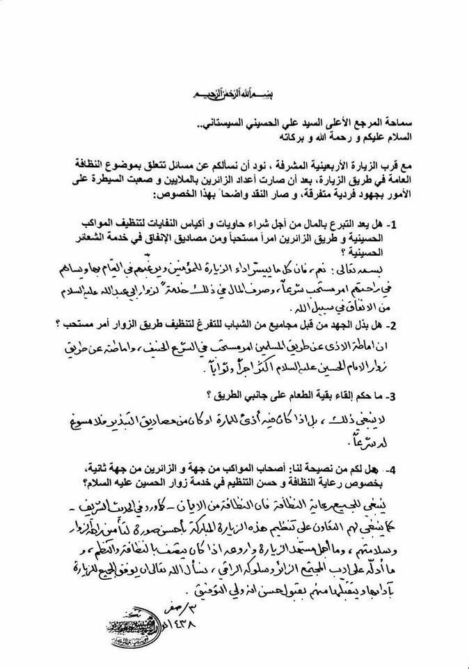 توجيهات المرجع الأعلى المفدى السيد السيستاني بخصوص النظافة في زيارة الأربعين