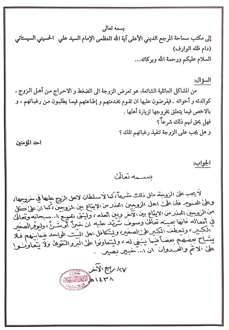 استفتاء صادر عن مكتب الامام المفدى السيد علي السيستاني حول المعاملة السيئة للزوجة