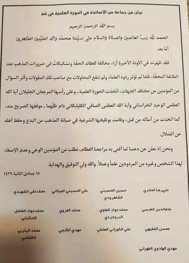بيان اساتذة الحوزة العلمية في قم المقدسة بتاييد موقف المرجعين الكبيرين الوحيد الخراساني والصافي الكلبايكاني من كمال الحيدري