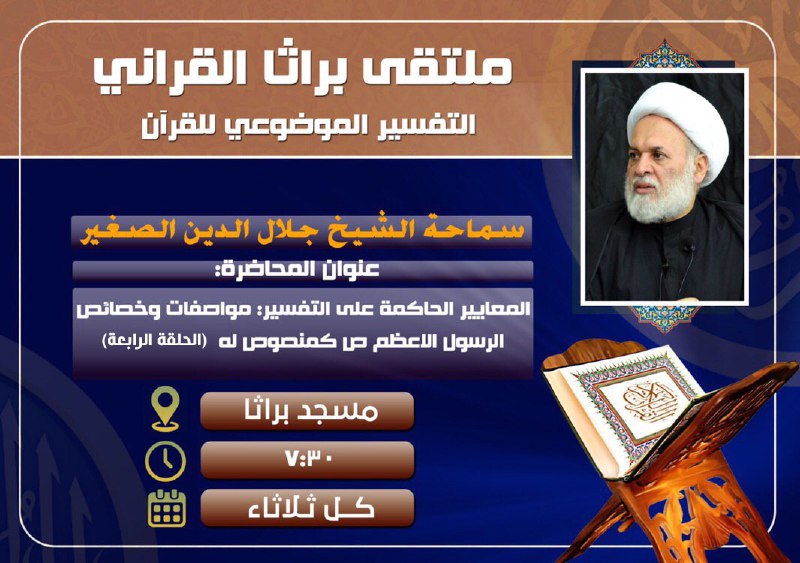 يتابع سماحة الشيخ حديثه في حلقته الرابعة عن مواصفات الرسول الاعظم صلوات الله عليه واله كمنصوص له باعتباره احد المعايير الثابتة الحاكمة على التفسير وذلك في ملتقى براثا القراني مساء هذا اليوم الثلاثاء يعقبه بحديث تحت عنوان: كيف نحصن وعينا؟