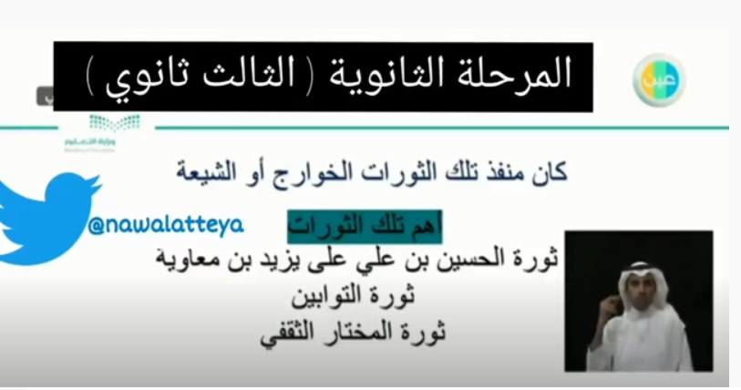 حيث تحدثت بشكل سافر مخزي عن الثورات التي خرجت على الطاغية المجرم يزيد بن معاوية بن ابي سفيان لعنهم الله محاولة رفع ِشأن يزيد لعنه الله لتقول ان منفذي الثورات على يزيد بن معاوية هم الخوارج او الشيعة مؤكدة ان هذه المعلومة جدا مهمة ويجب على الطلبة ان يعرفونها جيدا
