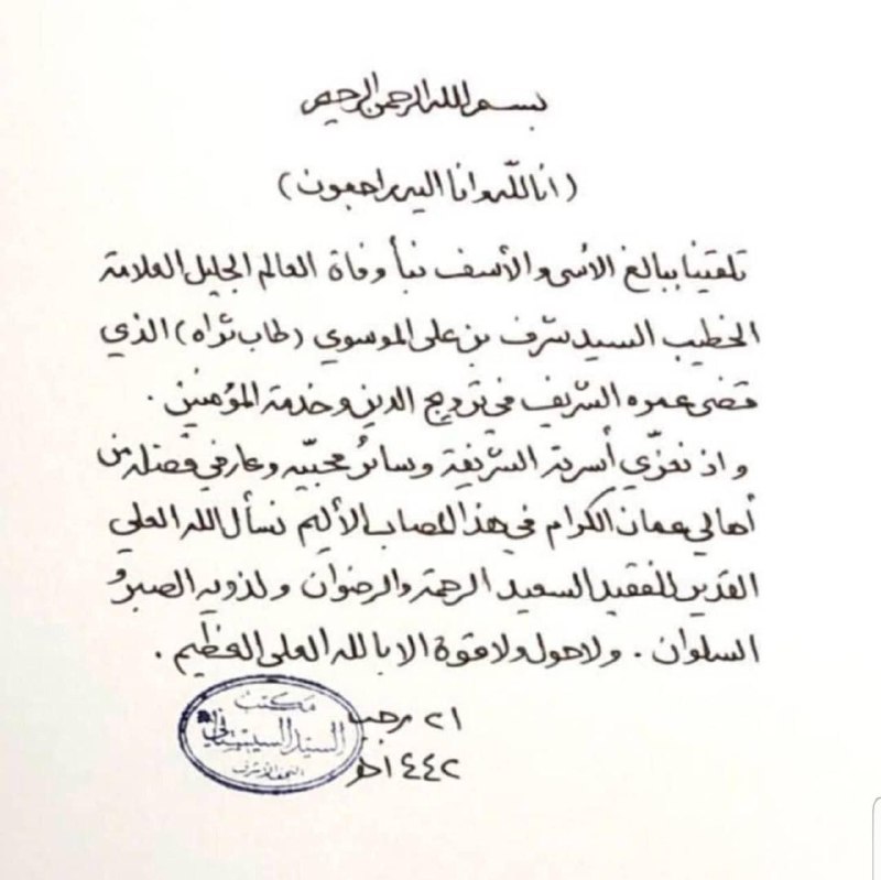 السلام عليكم ورحمة الله وبركات كل نفس ذائقة المو انا لله وانا اليه راجعون نسال المولى عز وجل ان يتفقد المرحوم الغلم الجليل شرف بن علي الموسوي برحمته الواسعة بحق نبينا ابو القاسم محمد واله الاطهار المطهرين صلوات الله عليهم وعلى اله الطيبين الطاهرين المظلومين واللعن الدائم على اعدائهم ابليس واعوانه اليهود والنصاري والمجوس الكفرة الفجرة ومن لف لفهم من الملحدين الكفرة الفجرة وان يتفضل علينا بالستر ونستعيذ ونستجير بالله منهم