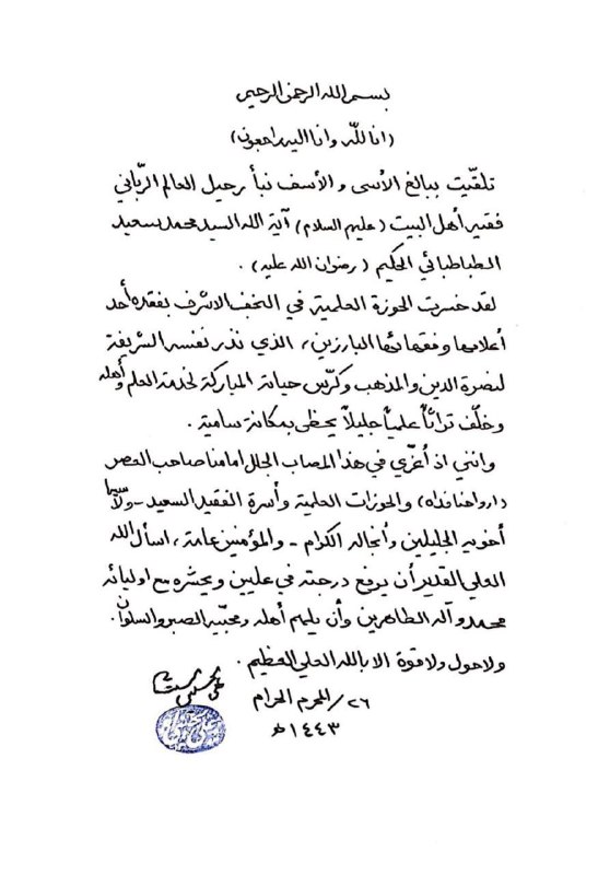 تلقيت ببالغ الأسى والأسف نبأ رحيل العالم الرباني فقيه أهل البيت (عليهم السلام) آية الله السيد محمد سعيد الطباطبائي الحكيم (رضوان الله عليه).