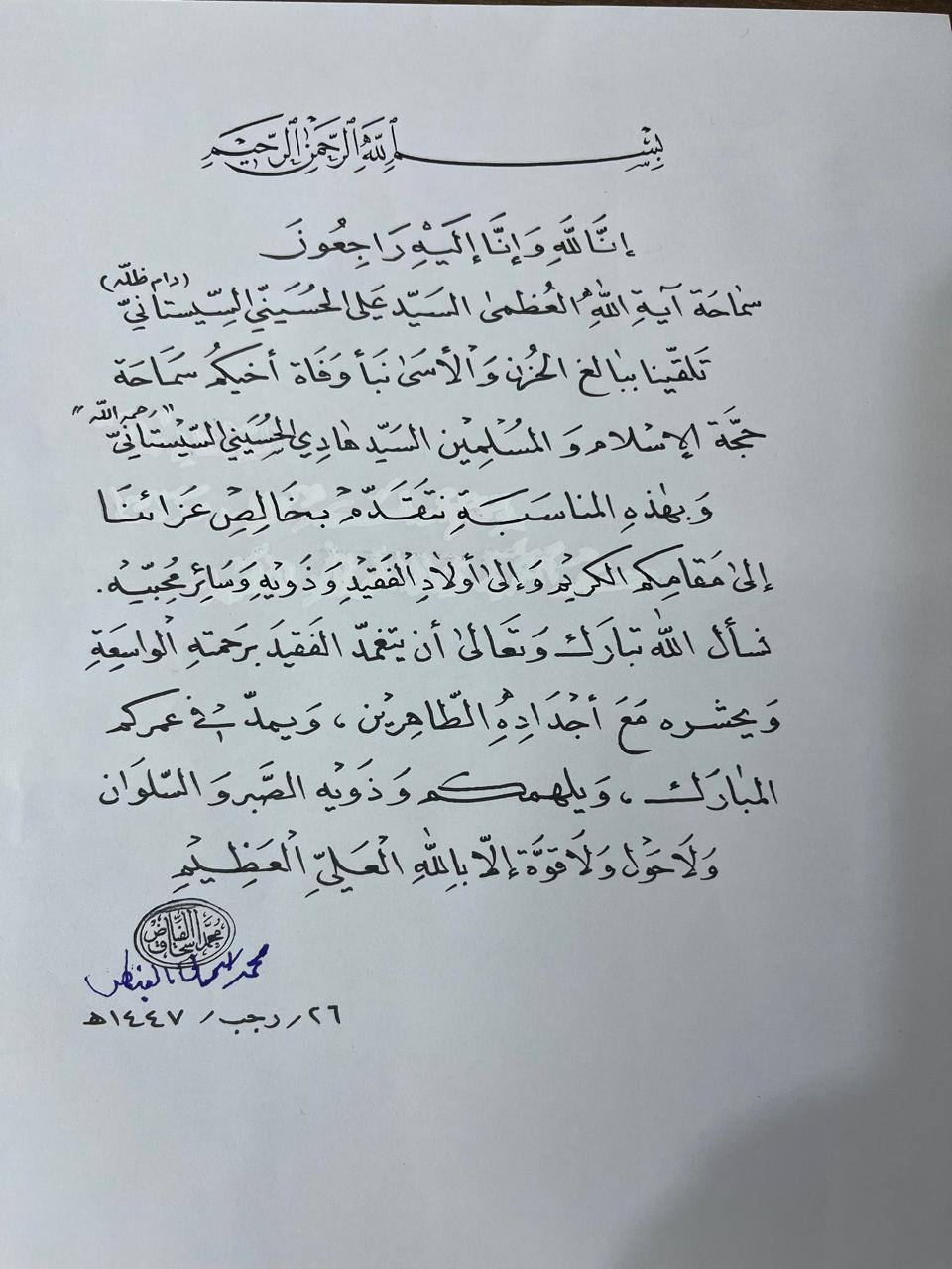 المرجع الكبير سماحة الشيخ اسحاق الفياض يعزي بوفاة شقيق المرجع الأعلى سماحة السيد السيستاني.