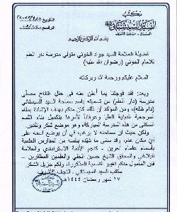 مكتب المرجع الاعلى السيد علي السيستاني يطالب السيد جواد الخؤي برفع اسم المرجع من على مصلى مدرسة شيدها الاخير