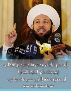 مفتي الجمهورية العربية السوريه في خطابه اليوم:الإرهاب إن أراد أن ينجس مقام سيدتي ومولاتي زينب بنت علي عليها السلام.. لن يدخل المقام إلا أن يدعس على جثتي