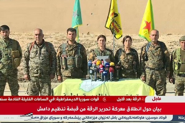 وأعلنت القوات في بيان تلته امرأة ترتدي ملابس عسكرية تقف إلى جوار عدد من المقاتلين من رجال ونساء إن قوات سوريا الديمقراطية هي فقط من ستشارك في العمليات مع غطاء جوي من طائرات قوات التحالف.