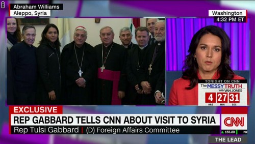 وقالت غابارد، في لقاء حصري مع CNN للحديث عن زيارتها السرية: "أجل لقد التقيت بالرئيس السوري بشار الأسد، والسبب الرئيسي الذي دفعني لزيارة سوريا هو معاناة الناس التي كانت تُثقل قلبي وقد أردت البحث عن طريقة للتعبير عن حب واهتمام الأمريكيين بالشعب السوري كما رغبت بأن أرى بنفسي ما يحصل هناك."