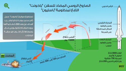 جدير بالذكر، أن منظومة "باستيون" المزودة بصواريخ "ياخونت" المجنحة المضادة للسفن، تفوق سرعتها ثلاث مرات سرعة الصوت، ويصل عددها في المجمع الصاروخي الواحد إلى 36 صاروخا.