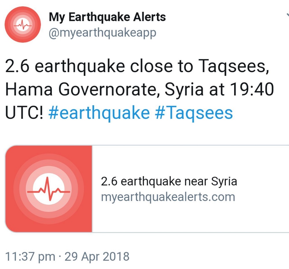 وزعم الموقع أن "الانفجار النووي" الذي استهدف مستودعا للذخيرة في مدينة حماة بسوريا،في ساعة متأخرة من ليل أمس، كان شديدا جدا حيث تسبب في حدوث زلزال بلغت قوته 2.6 درجة على مقياس ريختر.