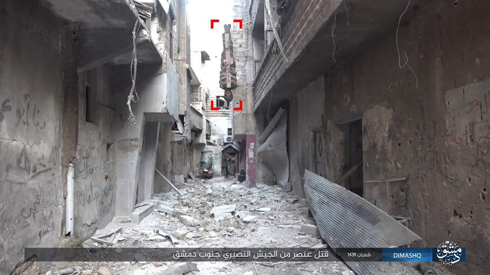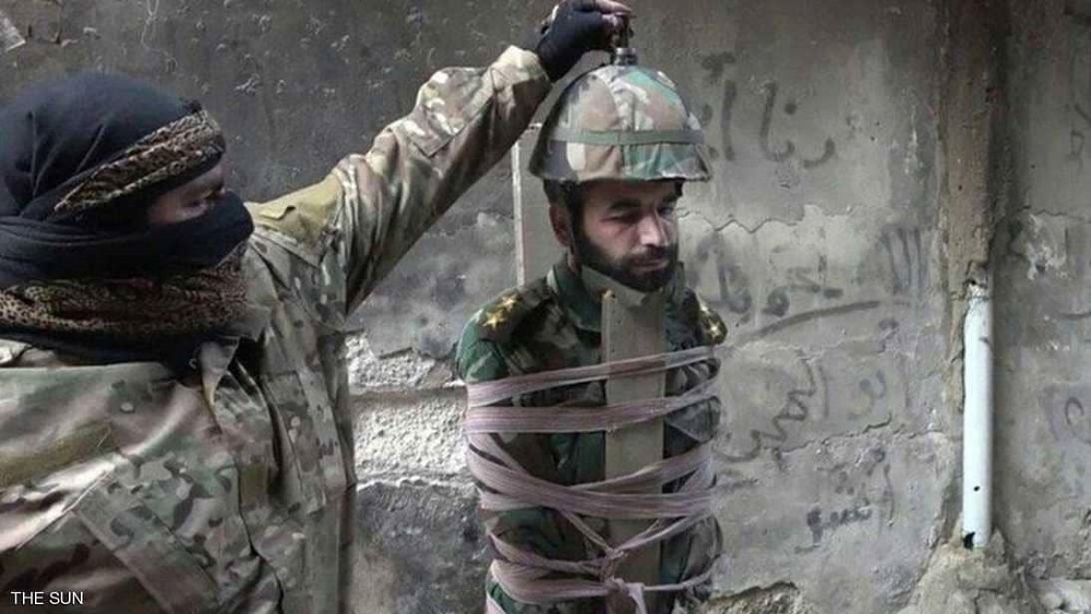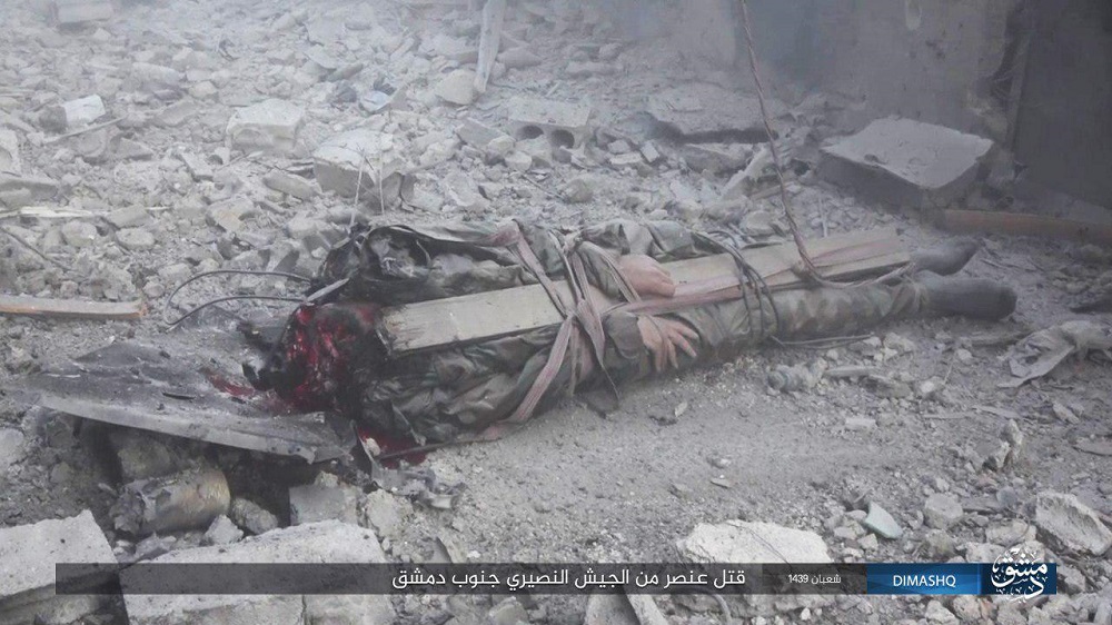الصور تظهر الضحية بأنه ضابط في الجيش السوري، الذي يشن هجوما على مخيم اليرموك للقضاء على تواجد التنظيم الارهابي فيه.