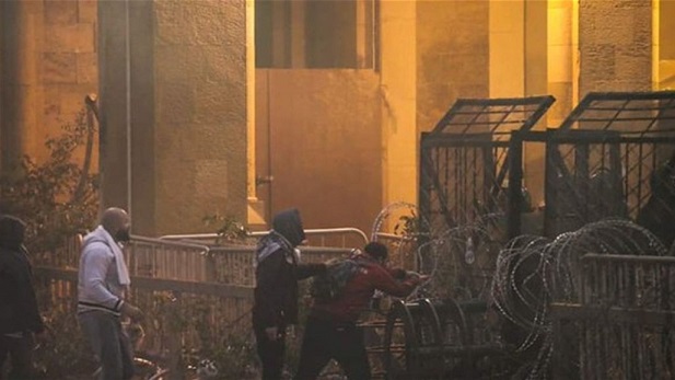 وعلى الأثر، بدأت القوى الأمنية بإطلاق القنابل المسيّلة للدموع باتجاه المحتجين الذين يرمون بدورهم الحجارة باتجاهها في وسط بيروت، كما استقدمت آلية لرشّ المياه من أجل تفريق جموعهم".
