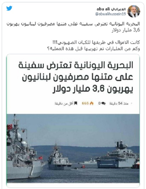 تداول مستخدمو منصات التواصل الاجتماعي، لا سيما في لبنان، وحتى بعض المواقع الإلكترونية الإخبارية، مطلع هذا الأسبوع، نبأ عن اعتراض البحرية اليونانية لسفينة تحمل مصرفيين لبنانيين وأجانب بحوزتهم مبالغ دولارية ضخمة يحاولون تهريبها.