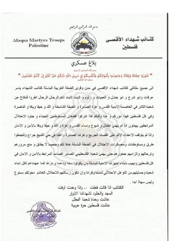 ووجهت الكتائب في بيان لها تحذيرا للمستوطنين الذين يشنون هجمات على المواطنين، وقال البيان: لتجعلو طرق ومستوطنات ومعسكرات الاحتلال في الضفة الباسلة هدفا لكم وجحيما لا يطاق، ومنع مرورهم وترحالهم والزامهم جحورهم".