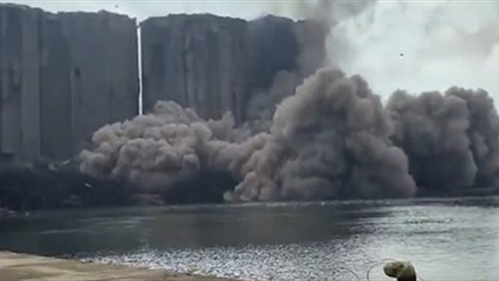 انهارت أجزاء من صوامع الحبوب الموجودة في مرفأ العاصمة اللبنانية بيروت، اليوم الأحد، بعد أيام من تعرضها للحريق واشتعال النار فيها.