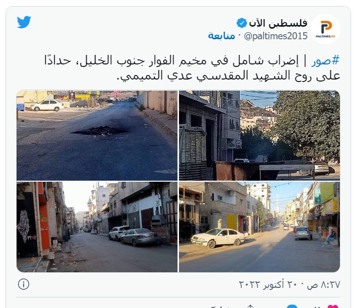 كما نعت القوى الوطنية والإسلامية في محافظة القدس الشهيد التميمي من مخيم شعفاط، اليوم الخميس، يوم حداد وإضراب تجاري على روحه، ويوم “نفير عام” في كل أرجاء العاصمة المحتلة، وأن ترفع الرايات السوداء على المؤسسات والمنازل.