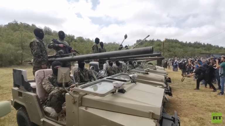 وقفز مقاتلون ملثمون عبر الأطواق المشتعلة وأطلقوا النار من مؤخرة الدراجات النارية، وقاموا بتفجير الأعلام الإسرائيلية في التلال أعلاه وجدار يحاكي الجدار الموجود على الحدود بين لبنان وإسرائيل.