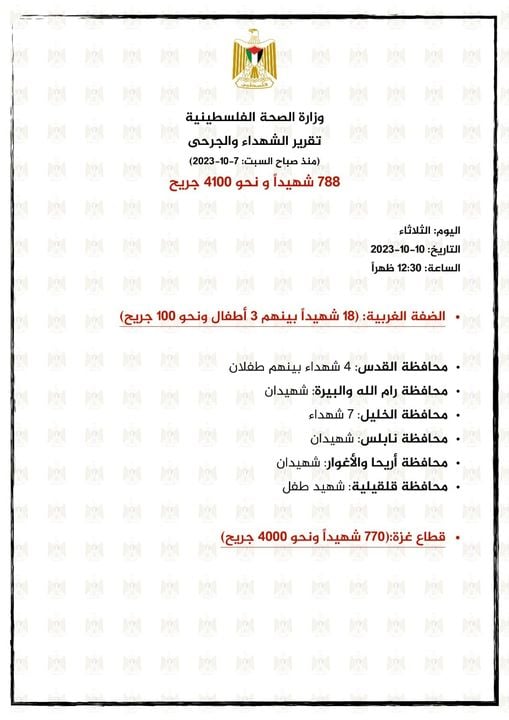 وذكرت الوزارة في بيان مفصّل، "ارتفاع عدد الشهداء إلى 788 والجرحى إلى 4100 في قطاع غزة والضفة الغربية".