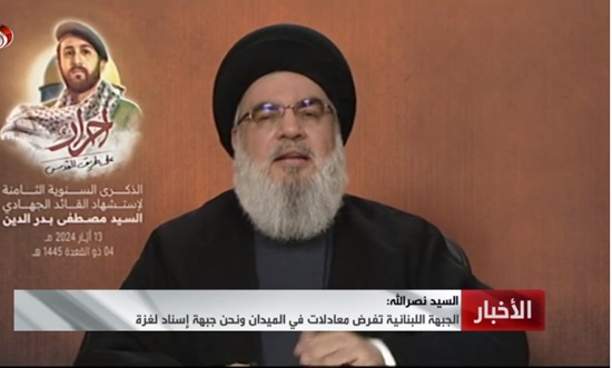 واكد السيد نصر الله ان "الجبهة اللبنانية تفرض معادلات في الميدان ونحن جبهة إسناد لغزة"، وشدد على ان "جبهة المقاومة في لبنان مستمرة في إسناد قطاع غزة وتصعد حسب معطيات الميدان"، واضاف "مهما كانت التضحيات اليوم فإن هذه المعركة تاريخية وتصنع الإنجاز التاريخي والحقيقي وجبهة الإسناد اللبنانية مستمرة كما ونوعا وتفرض معادلات والربط مع جبهة غزة هو أمر قاطع"، وشدد على ان "الجبهة اللبنانية مستمرة في مساندة غزة وهذا أمر حاسم ونهائي، والأميركي والفرنسي سلّم بهذه الحقيقة"، وتابع "نقول لمستوطني الشمال اذهبوا لحكومتكم وقولوا لهم أوقفوا الحرب على غزة".