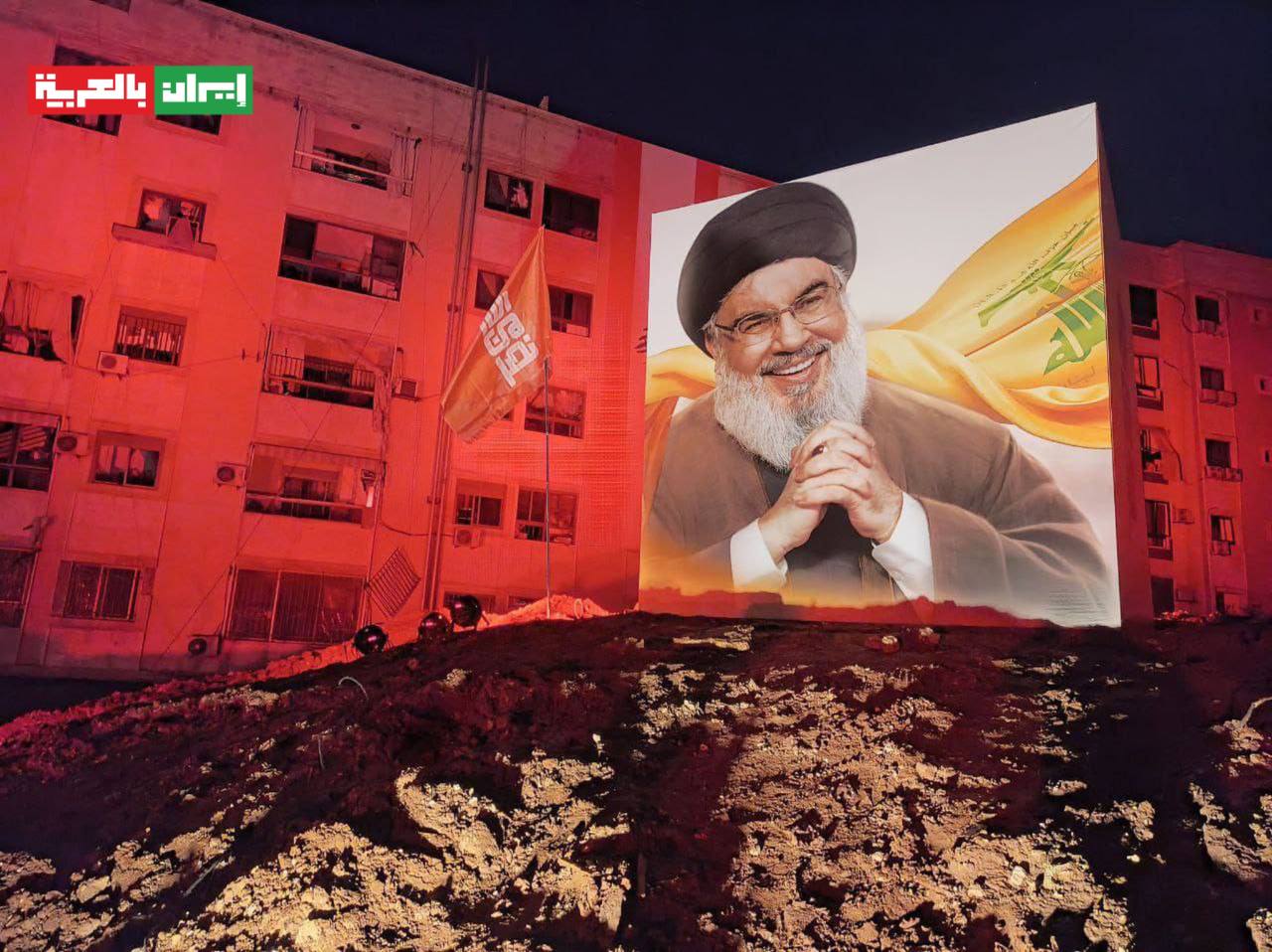 رُفِعَت صورٌ على الأبنية السكنيّة للأمين العام لـ"حزب الله" الشهيد السيد حسن نصرالله في المكان الذي استشهد فيه في منطقة حارة حريك في الضاحية الجنوبية لبيروت.