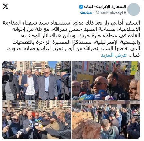 تفقد سفير إيران لدى لبنان مجتبى أماني، اليوم الثلاثاء، موقع اغتيال الامين العام لحزب الله السيد حسن نصر الله في أول ظهور علني في بيروت، بعد إصابته في هجمات أجهزة "البيجر" التي نفذتها إسرائيل منتصف أيلول الماضي.