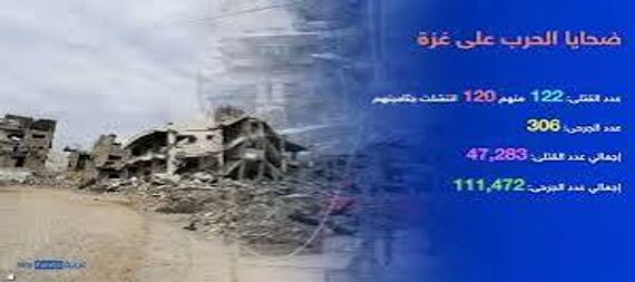 وقالت المصادر، أن عدد الإصابات ارتفع إلى 111,472، منذ بدء العدوان الإسرائيلي، في حين لا يزال آلاف الضحايا تحت الأنقاض.