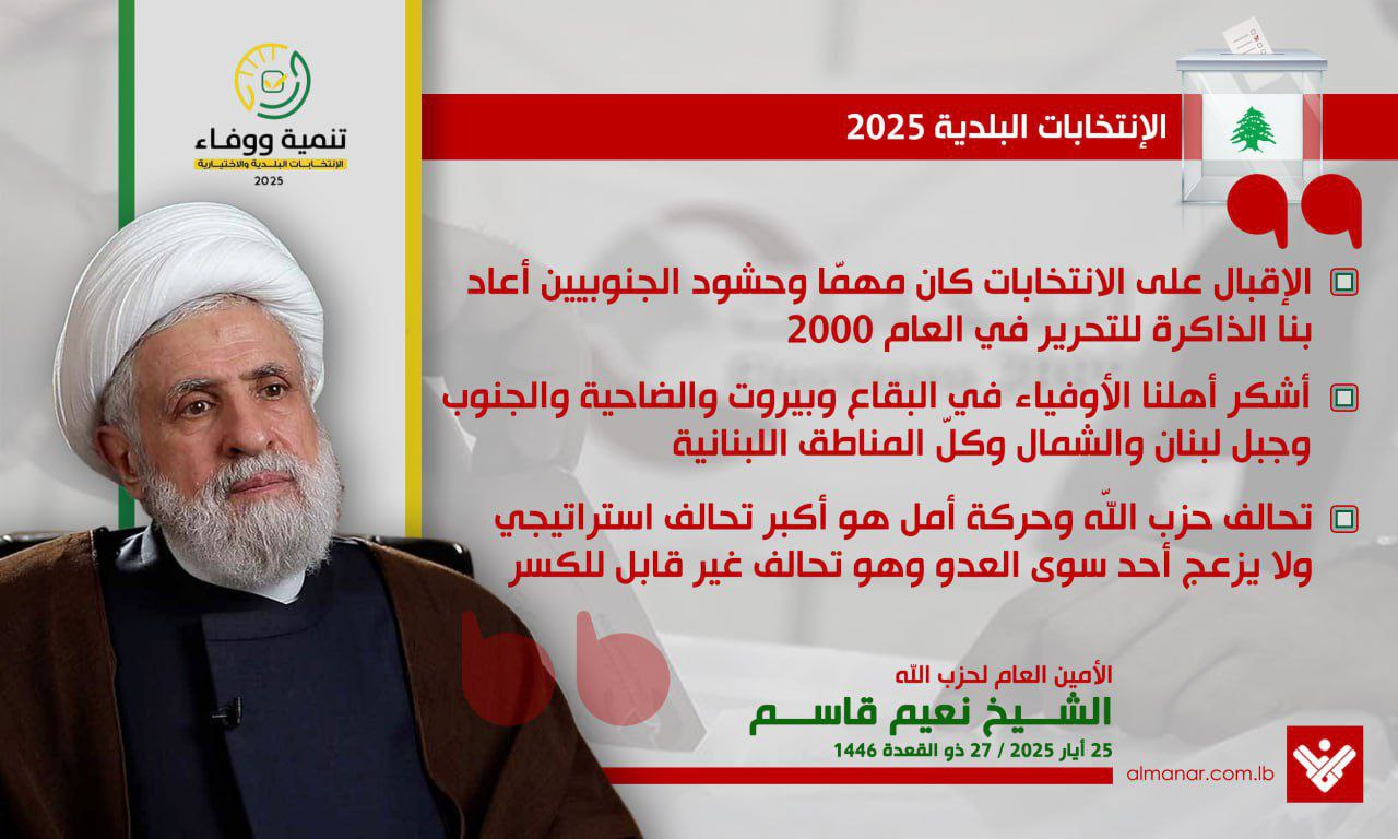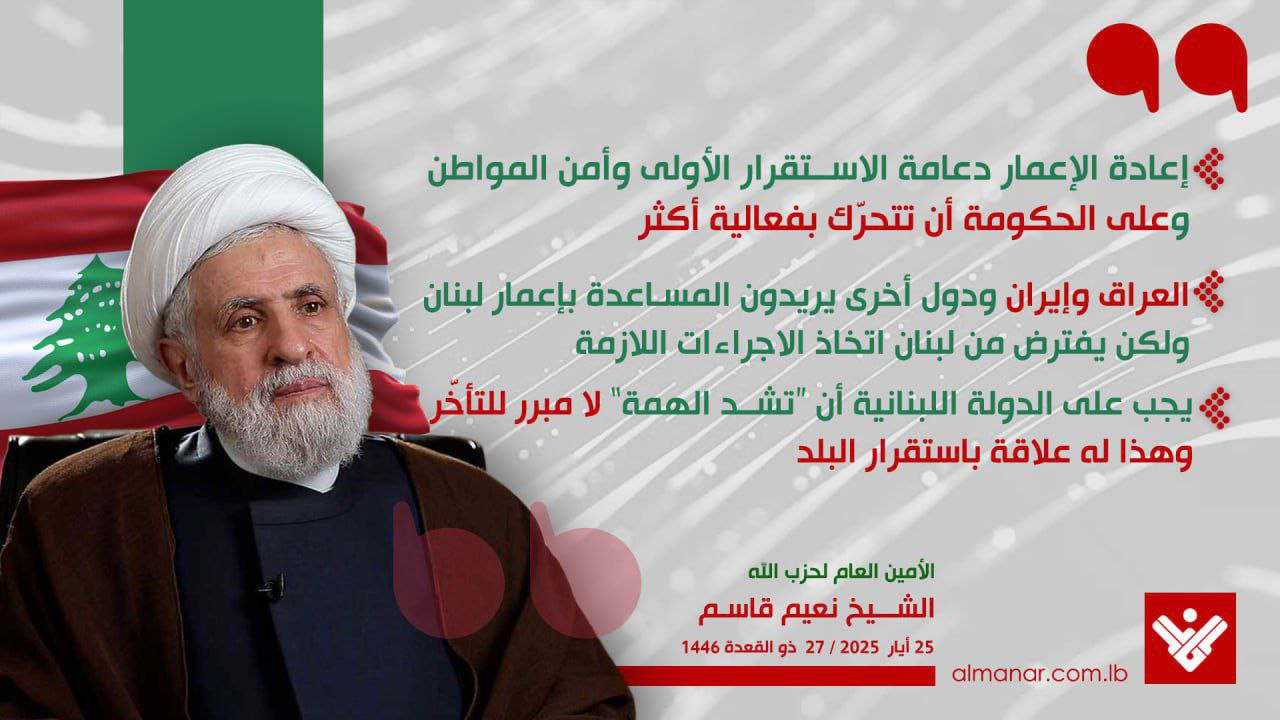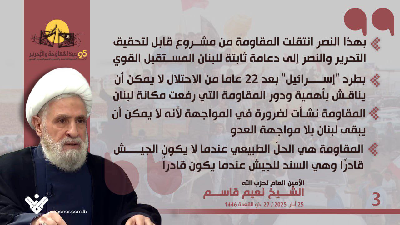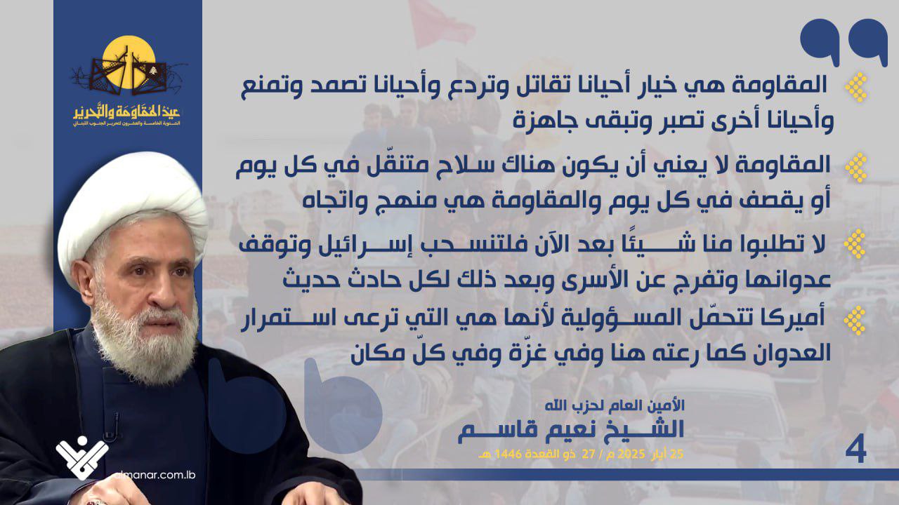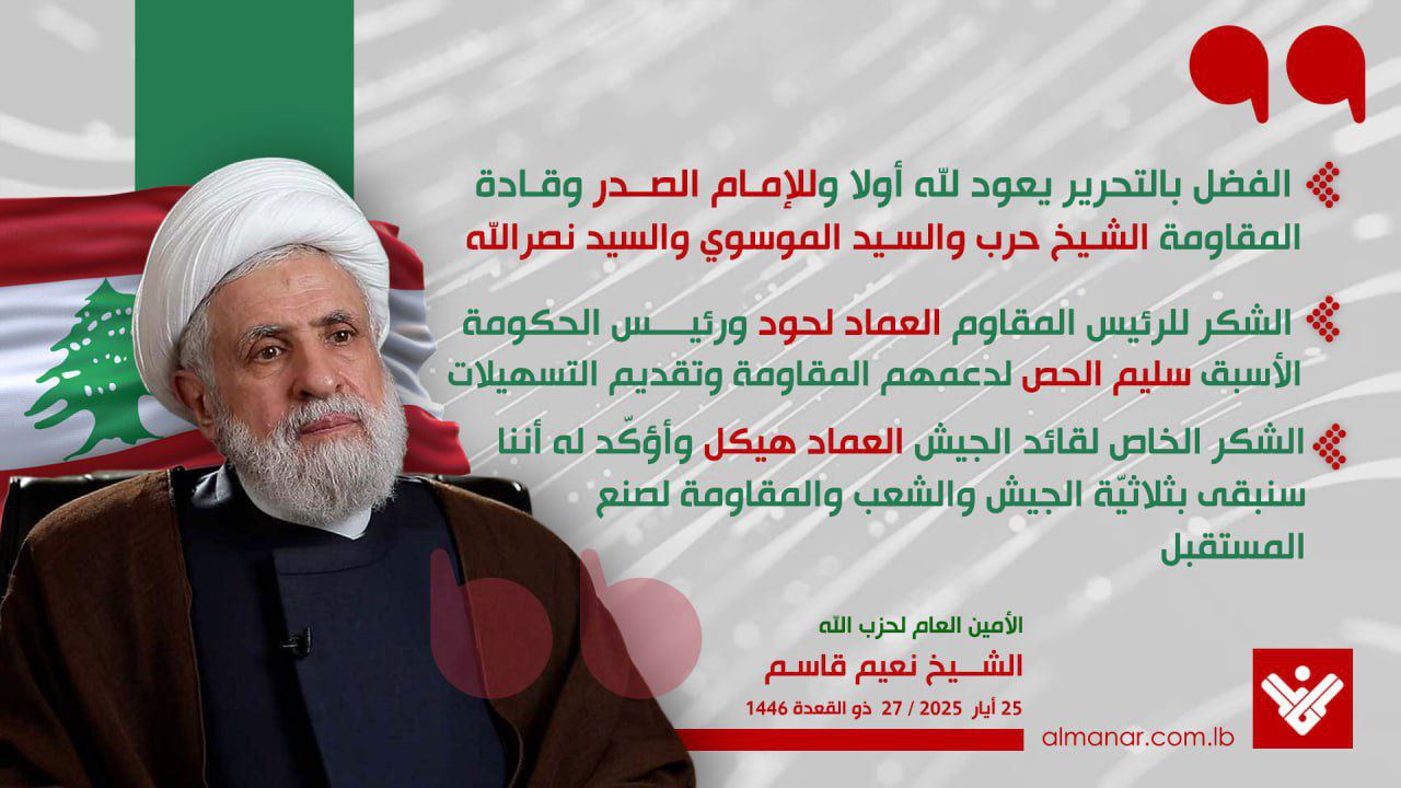 أبرز ما ورد في كلمة الأمين العام لحزب الله الشيخ نعيم قاسم بمناسبة عيد المقاومة والتحرير