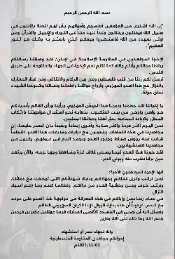 رسالة مجاهدوا المقاومة الإسلامية في فلسطين الى المجاهدين في المقاومة الإسلامية بلبنان (حزب الله) .