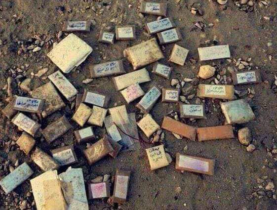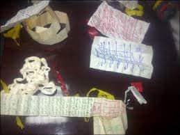 وتناقلت مواقع التواصل الاجتماعي صورا تظهر فيها لفافات كتبت عليها أسماء ورموز توحي الى السحر والشعوذة.