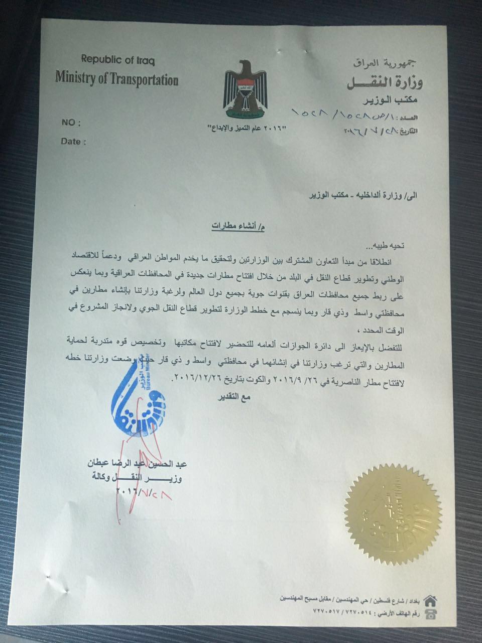 وجه وزير النقل وكالة، عبد الحسين عبطان، الخميس، كتابا رسميا الى وزير الداخلية طالبه فيه الايعاز باكمال اختام مطاري الكوت والناصرية الدوليين للاستعداد لافتتاحهما في الموعد المحدد.