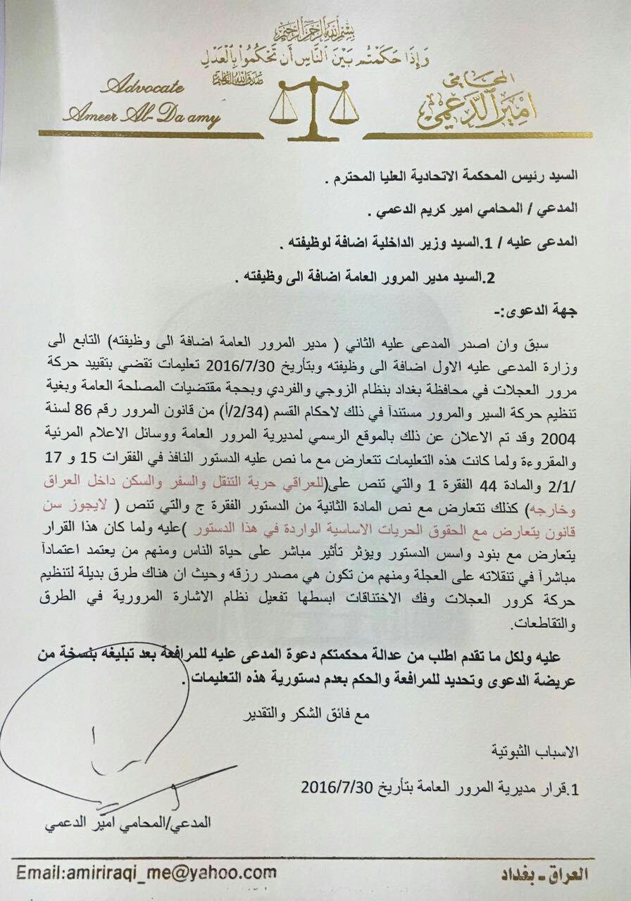 تنشر وكالة أنباء براثا نص عريضةالدعوى التي أقامها المحامي أمير كريم الدعمي ضد وزير الداخلية ومدير المرور العام أضافة لوضيفتيهما بسبب قرار سير السيارات مياومة وحسب التواريخ الزوجية والفردية