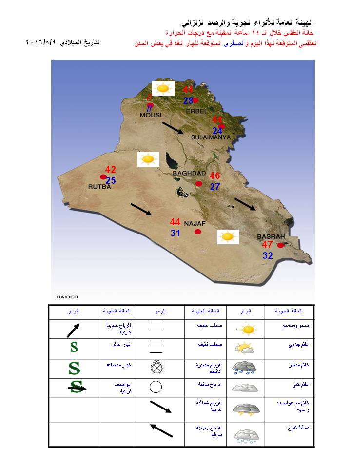 درجة الحرارة العظمى المتوقعة في مدينة بغداد (47) م° .